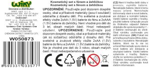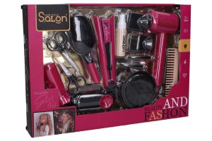Kosmetický set s fénem a žehličkou set. Baterie do fénu 2xAA nejsou součástí, baterie do žehličky 2xAAA nejsou součástí. Obsahuje fén, žehličku, kartáč, hřeben, 2x nůžky, 2x sponky, sprej, nástavce.