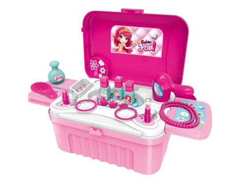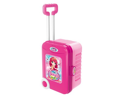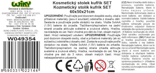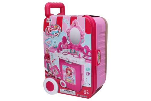 Kosmetický stolek kufřík. Velikost 38cm . Kufřík je na kolečkách a má vysunovací madlo. Výška s vysunutým madlem 55,5cm, výška se zasunutým madlem 38cm. Kufřík jde přestavět na kosmetický stolek o rozměrech: 60x50x21cm. Návod na sestavení na obale. Obsahuje fén, kartáč na vlasy, náramky a další příslušenství. Baterie 3xAAA nejsou součástí. Zezadu zrcadla je vypínač na jeho rozsvícení. světelné a zvukové efekty
