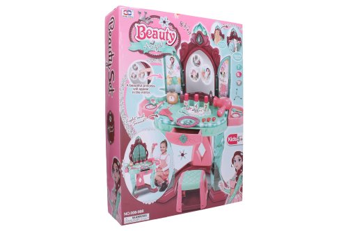 Kosmetický stolek s efekty. Rozměry 57x34x76cm. Světelné a zvukové efekty. Návod na složení na obale. 3xAA baterie nejsou součástí. Po zamávání 5cm před krystalem nad zrcadlem se otevře zrcadlo a zobrazí se na něm obrázky princezen. Obsahuje stolek se zrcadlem, židličku a příslušenství.