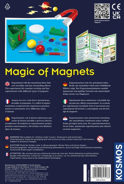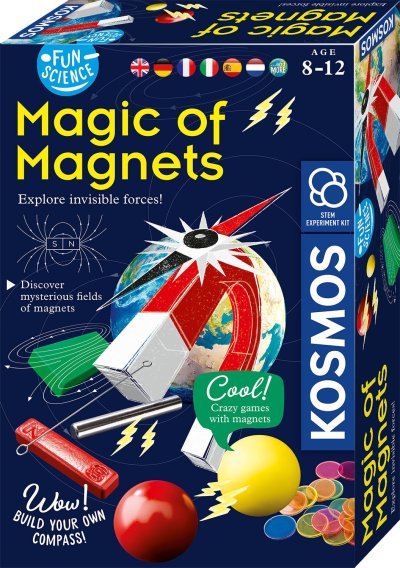 KOSMOS Kouzlo magnetů vědecký set. Instrukce na provedení 9 pokusů. Obsahuje magnety a jiné příslušenství potřebné k provádění pokusů. doporučený věk 8-12 let. Český návod ke stáhnutí v digitální podobě-QR kód na krabici a v návodu.