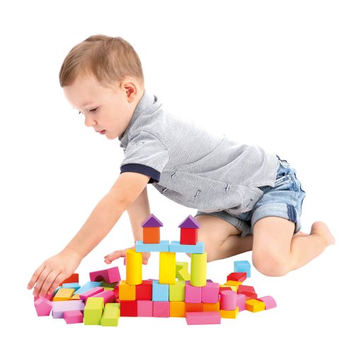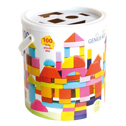 Kostky jasných atraktivních barev a různých tvarů v praktickém kyblíku z kartonu. Víko kyblíku promění balení v hravou vkládačku, může tak dále rozvíjet rozpoznávání tvarů a jemnou motoriku. Hlavní vlastnosti:vkládačka se 100 kostkamipraktické balení