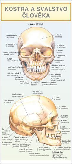 Barevné ilustrace lidského skeletu, svalstva a detaily jednotlivých částí těla. Vhodné pro studenty biologie, zdravotnické školy, masérské kurzy, archeology.