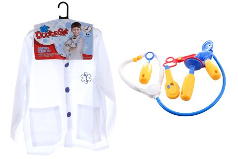 Kostým doktorka. Balení obshauje plášť, roušku a soustu pomůcek nezbytných pro malou doktorku. Rozměry pláště cca 40x54 cm, délka rukávu od ramene cca 42 cm. Materiál polyester+plast. Baleno v sáčku. Rozměry balení cca 36x51x4 cm. Věk 3+