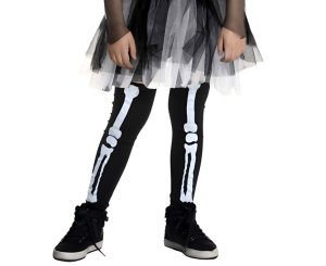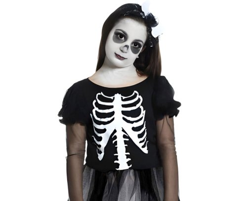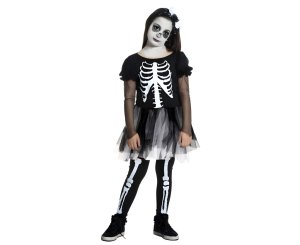 Na doprovodných fotografiích je patrné, že k šatům jsou nošeny černé legíny s potiskem kostí, které však nejsou součástí balení. Celkový vzhled doplňuje černá stuha s bílou mašlí ve vlasech modelky, která přidává kostýmu hravý a dívčí charakter. Výrazný kostým je ideální volbou pro děti, které chtějí na karnevalu nebo halloweenské oslavě zaujmout a zároveň si užít pohodlí při nošení.