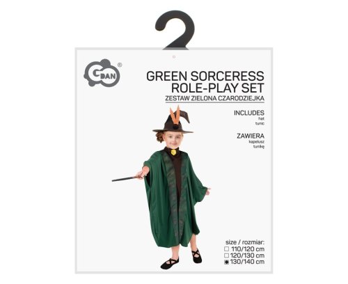 Dětský kostým Kouzelník/Kouzelnice v zelené barvě je určený pro děti s výškou 130 až 140 cm. Tento kostým zahrnuje dva hlavní prvky – kouzelnický plášť a klobouk, které společně vytvářejí autentický vzhled čaroděje či čarodějky. Plášť je vyroben z lehkého materiálu v tmavě zeleném odstínu, který působí elegantně a zároveň tajemně. Jeho střih je volný a splývavý, což umožňuje pohodlný pohyb a snadné převlékání. Na přední straně pláště je tmavší zelený lem s jemným vzorem, který dodává celému kostýmu na detailu a zajímavosti.