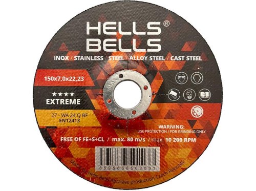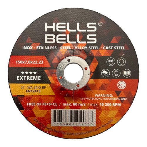 Brusné kotouče Hells Bells s bakelitovým pojivem jsou vyrobeny z prémiového korundového zrna, které je zárukou agresivního brusu a dlouhé životnosti. Neobsahují stopy železa, chlóru a síry. Jsou určeny pro broušení uhlíkových ocelí, konstrukčních ocelí a nerezových ocelí.