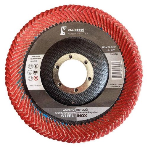 • brusný kotouč se špičkovým samoostřícím keramickým brusivem, kde lamely jsou na všech pracovních plochách (spodní, čelní a horní) kotouče a tvarově jsou přizpůsobeny pro broušení standardně i obtížně dostupných svarových ploch jakýchkoliv svarků jakož i všech typů obrobitelných materiálů, běžné oceli a ocele vyšších pevností, legovaná ocel, nerezovaných ocelí, tvrdých materiálů, svařovacích materiálů atd.