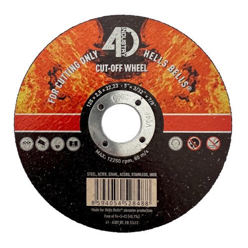 Řezné kotouče Hells Bells s bakelitovým pojivem jsou vyrobeny z prémiového korundového zrna, které je zárukou rychlého řezu a dlouhé životnosti. Neobsahují stopy železa, chlóru a síry. Jsou určeny pro řezání uhlíkových ocelí, konstrukčních ocelí a nerezových ocelí.