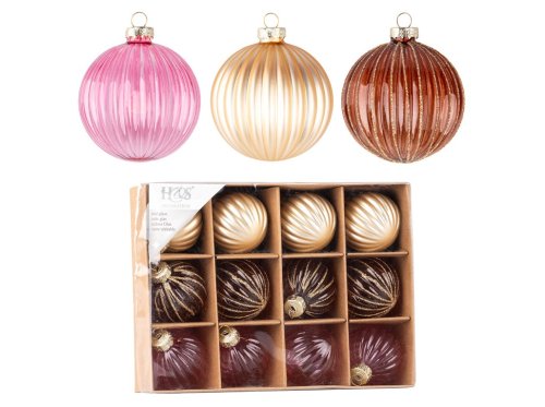 Sada 12 skleněných koulí na vánoční stromeček o průměru 40 mm. Koule jsou dodávány v barevném mixu – čirá s glitrem a růžová, což vytváří jemný a elegantní vzhled.