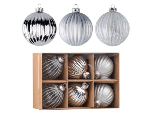 Sada 6 skleněných koulí na vánoční stromeček o průměru 60 mm. Koule jsou dodávány v barevném mixu – čirá s glitrem, stříbrná a šedá, což vytváří elegantní a nadčasový vzhled.