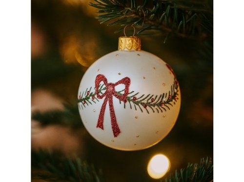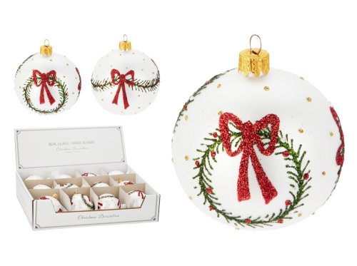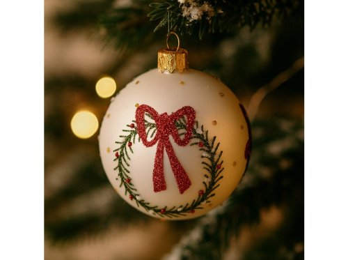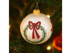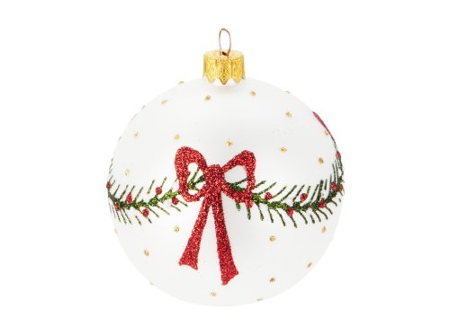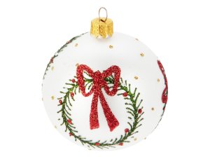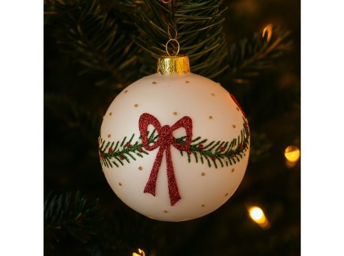 Skleněná koule na stromeček o průměru 80 mm zdobená mašlí a girlandou v matném provedení. Koule dodává vánoční výzdobě jemný a sofistikovaný vzhled.