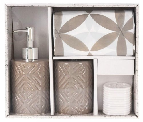 set koupelnových doplňků ve světle hnědé barvě- vyrobené z keramiky s lesklou glazurou, závěs z PEVA- v sadě najdete také 12 háčků pro jednoduché připevnění závěsu- rozměr sprchového závěsu 180 x 180 cm- sada obsahuje 3 ks- dávkovač na mýdlo- držák na zubní kartáčky- sprchový závěs + 12 x háček na závěs- barva: hnědá / bílá- značka: Homestyling