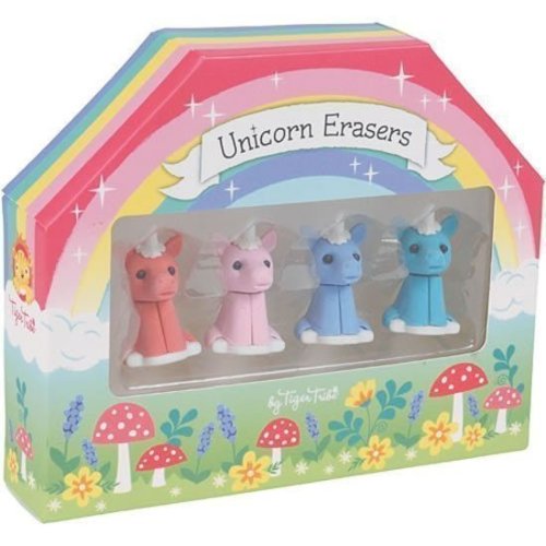 Roztomilý dárek pro všechny milovníky jednorožců. Tito gumoví jednorožci o velikosti 3,5 cm jsou ideální pro vymazání všech vašich kreseb a chyb v sešitech doma nebo ve škole. Čtyři gumy ve tvaru jednorožců v pastelových barvách jsou uloženy v malé duhové krabičce.