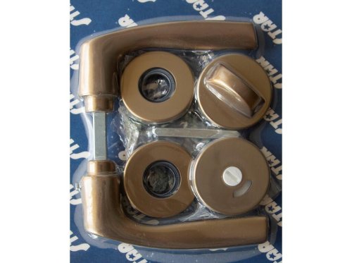 Kování MONET-Rozeta F4, WC, BRONZ elox. rozměry: - průměr rozety: 50 mm - klika: 107 mm provedení: klika - klika WC povrch: bronzový eloxovaný hliník Rozetové kování pro interiérové dveře.
