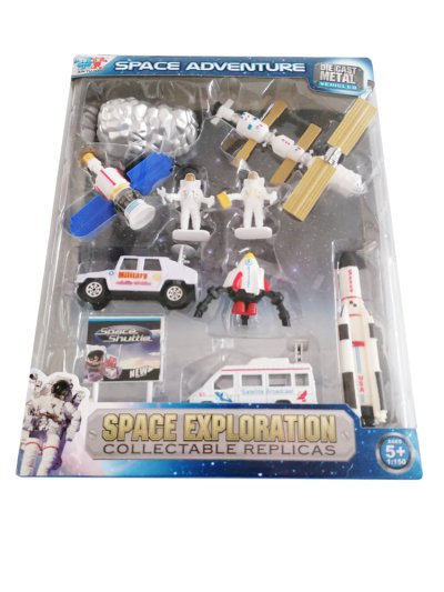 Kovová vesmírná sada, která obsahuje raketu, kosmonauty, družice, vozidlo…