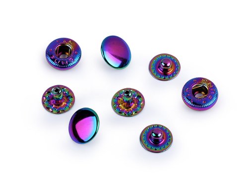 Kovové druky zdobí efektní holografický povrch, který hází zajímavé odstíny. Využijete je převážně na koženou galanterii, tašky, kabelky apod. Jsou určené ke spojování středně silných látek o tloušťce 0,5 - 1,5 mm. Nýtování se provádí pistonem a lisem, který najdete pod kódem 790770 nebo 070241. Sada se skládá ze 4 dílů.