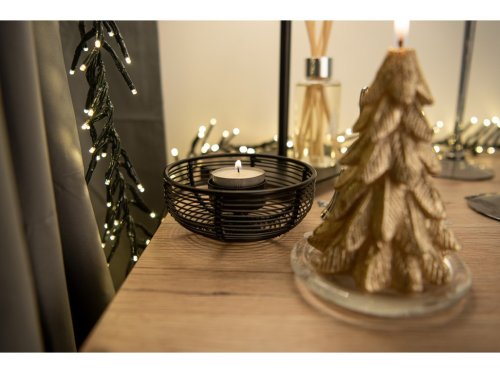 Kulatý kovový svícen o rozměru 110 × 50 mm je určen pro čajové svíčky. Černé provedení dodává dekoraci moderní a elegantní vzhled, vhodný pro stolní aranžmá, parapet nebo poličku. Svícen poskytuje bezpečné a stabilní umístění svíčky a vytváří útulnou atmosféru.
