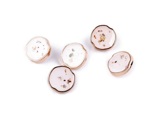 Luxusní kovové knoflíky zaujmou svým designem - mají nepravidelný kulatý tvar a naleznete v nich drobné kousky perleti zalité v pryskyřici. Vyniknou na košilích, svetrech, šatech, kabátech i taškách. Velikost knoflíků naleznete v této tabulce.