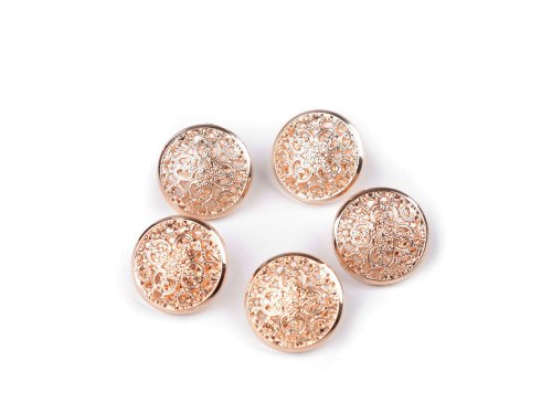 Kovové knoflíky zdobí filigránový vzor. Jsou vyrobené ze slitiny zinku a nemagnetických kovů. Mají spodní přišívání. Knoflíky podtrhnou eleganci kabátů, sak, košil apod. Vyniknou také na doplňcích jako jsou kabelky, tašky nebo klobouky. [Knoflíky jsou baleny v sáčku.]Velikost knoflíků naleznete v této tabulce. [Zinek chrání kov proti korozi. Pozinkované výrobky po vyprání zůstávají beze změn.]