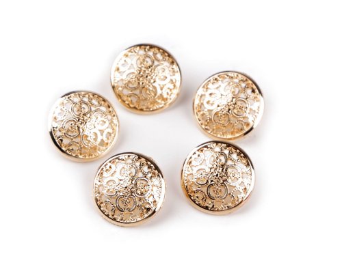 Kovové knoflíky zdobí filigránový vzor. Jsou vyrobené ze slitiny zinku a nemagnetických kovů. Mají spodní přišívání. Knoflíky podtrhnou eleganci kabátů, sak, košil apod. Vyniknou také na doplňcích jako jsou kabelky, tašky nebo klobouky. [Knoflíky jsou baleny v sáčku.]Velikost knoflíků naleznete v této tabulce. [Zinek chrání kov proti korozi. Pozinkované výrobky po vyprání zůstávají beze změn.]