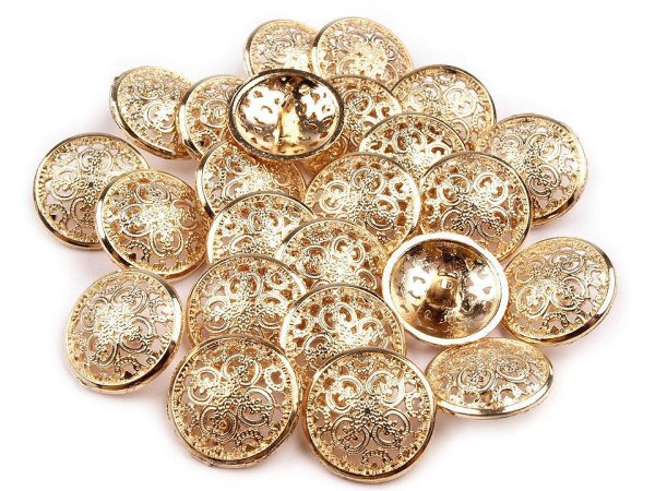 Kovové knoflíky s filigránovým vzorem jsou vyrobené ze slitiny zinku a nemagnetických kovů. Mají spodní přišívání. Knoflíky elegantně vyniknou na kabátech, sakách, košilích apod. Zajímavě ozdobí také kabelky, tašky nebo klobouky. [Knoflíky jsou baleny v sáčku.]Velikost knoflíků naleznete v této tabulce. [Zinek chrání kov proti korozi. Pozinkované výrobky po vyprání zůstávají beze změn.]