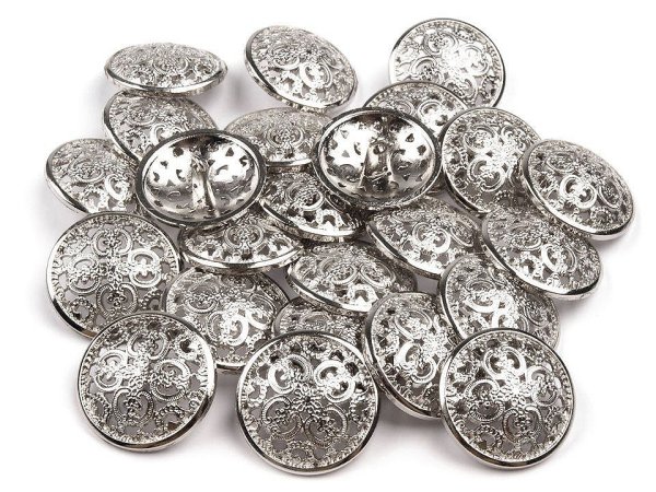 Filigránový vzor dodává knoflíkům umělecký nádech. Jsou vyrobené ze slitiny zinku a nemagnetických kovů. Mají spodní přišívání. Knoflíky podtrhnou dokonalost kabátů, sak apod. Vyniknou také na doplňcích jako jsou kabelky, tašky nebo klobouky. [Knoflíky jsou baleny v sáčku.]Velikost knoflíků naleznete v této tabulce. [Zinek chrání kov proti korozi. Pozinkované výrobky po vyprání zůstávají beze změn.]