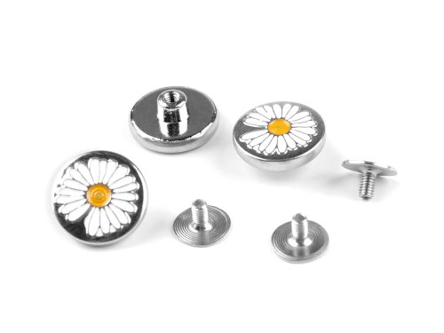 Kovový riflový knoflík je výjimečný tím, že se nenaráží, ale šroubuje, a tak vám ušetří práci i čas. K aplikaci nepotřebujete žádné další pomůcky. Skládá se ze dvou částí (samotného knoflíku a šroubovacího nýtu). Na knoflíku najdete smaltovaný obrázek kopretiny. Knoflíky vyniknou na riflích, džínových bundách, vestách, šatech apod. Délka nýtu je 4 mm. Velikost knoflíků naleznete v této tabulce.