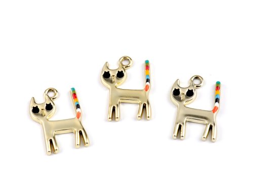 Kovový přívěsek kočky s barevným smaltem má mnohostranné využití. Jednu stranu má s barevným smaltem, druhá strana má jemný reliéf. Přívěsek je z nemagnetického kovu.