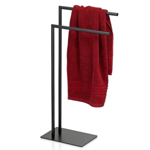 Elegantní a tvarovaný – držák na ručník STYLE v černé barvěDržák ručníku je díky své obdélníkové základně a 2 mírně posunutým držákům na ručníky ve tvaru L elegantní a tvarovaný. Dodejte své koupelně moderní nádech – s matně černými doplňky ze série Style.Gumové nožičky na spodní straně věšáku na ručníky zajišťují stabilní stojan.Klozetový set STYLE je k dispozici také v ladícím s věšákem na ručníky STYLE a obě varianty jsou dostupné i v chromovaném lesklém vzhledu ve stříbrné barvě.Držák na ručník Style vyrobený z kovu, matný práškový lak. Rozměry: 30 x 20 x 81 cm.