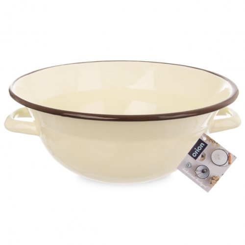 Zadělávací smaltovaná mísa s uchy. Barva smetanová, hnědý okraj. Průměr 26 a výška 11 cm, objem po skosenou hranu 2.5 litru. EAN 8592381069513