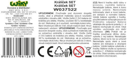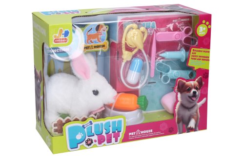 Králík chodící. Velikost 15 cm. Obsahuje: králíka, misku, mrkev, lahvičku, fonendoskop, injekci, nůžky, pinzetu. 2xAA baterie nejsou součástí. Králík hopká, vydává zvuk.