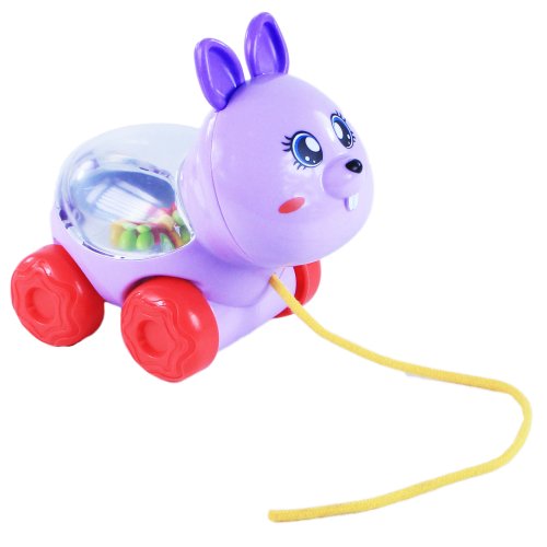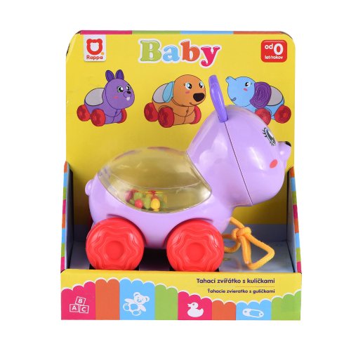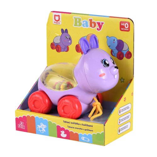 Veselé zvířátko králík na kolečkách s barevnými kuličkami. Taháním či pohybem zvířátka začnou kuličky uvnitř poskakovat. Tato hračka zaujme a pobaví i ty nejmenší děti.
