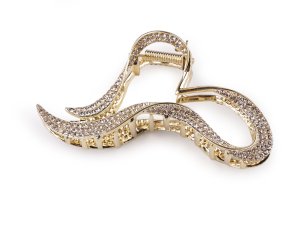 Kovový skřipec do vlasů je bohatě zdobený třpytivými broušenými kamínky, díky nimž je nepřehlédnutelný.