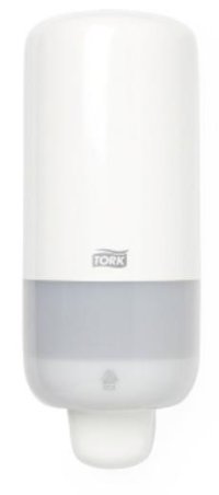 Dávkovač na tekuté mýdlo značky Tork S-Box S4 v bílé barvě s obsahem 475 ml a hmotností 0,40 kg má ergonomický design a disponuje tlačítkem pro pohodlné použití.