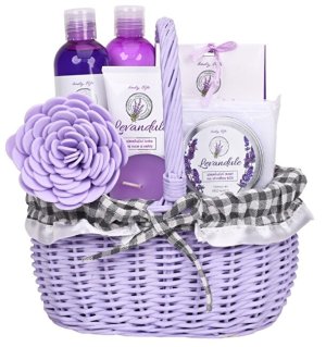 Krásné dárkové balení voňavé levandulové kosmetiky v dekorativním proutěném koši.