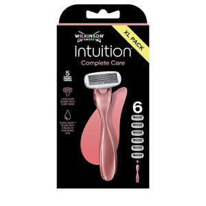 Výměnné hlavice Wilkinson Quattro Titanium Sensitive s olejovým proužkem s výtažky z aloe vera a jojoby mají čtyři holicí a jeden zarovnávací břit pro dokonale oholenou pokožku.