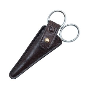 Zastřihávací nůžky na vousy jsou zabaleny v pouzdru z přírodně barvené kůže a zajištěny řemínkem a mosaznou sponou.