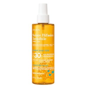 Dvoufázový sprej na opalování obsahuje směs fotostabilních filtrů, které zajišťují kompletní ochranu před UVA a UVB zářením.