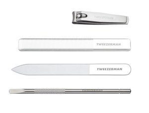 Sada špičkových nástrojů na manikúru Tweezerman pro dokonalou péči o vaše nehty: kvalitní kleštičky z nerezové oceli, dva pilníky pro zabroušení ostrých nehtů a leštička pro oslnivý vzhled nehtů.