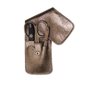 Cestovní manikúrová třídílná sada Pfeilring Solingen v zajímavém bronzově metalickém obalu z pravé kůže.