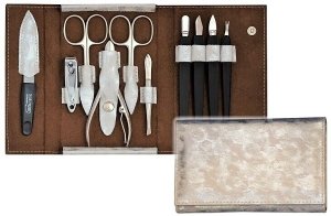 Stříbrno béžové 10dílné pouzdro z pravého semiše obsahuje nůžky na nehty, nůžky na kůžičku, kleštičky na nehty 5,5cm, kleště na nehty 10cm, šikmou pinzetu, safírový pilníček 12cm, vidličku na nehtovou …