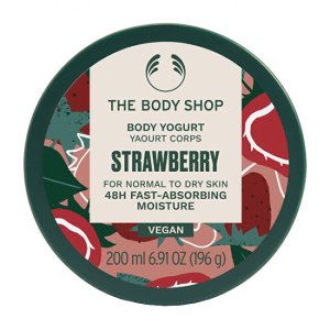 Veganský tělový jogurt s lehkou konzistencí a vůní jahod se okamžitě vstřebává do pokožky a poskytuje jí hydrataci až na 48 hodin.