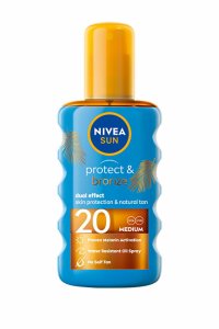 Hedvábný voděodolný olej na opalování ve spreji podporující zhnědnutí.