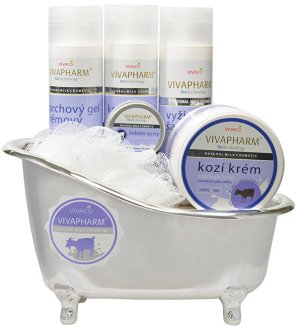 Dárkové balení kosmetiky s kozím mlékem pro péči o pokožku těla i obličeje v dekorativní vaničce.