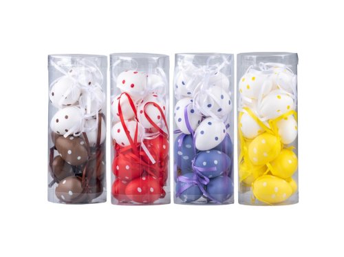 Sada 12 plastových kraslic o velikosti 40 mm s puntíkovým motivem. Kraslice jsou dodávány v barevném mixu a baleny v praktickém tubusu, jednotlivé kusy se mohou lišit barvou nebo vzorem.