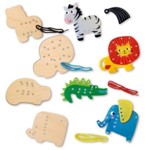 Tato kreativní a edukační sada je skvělá pro malé ruce a rozvoj motoriky! Děti používají barevné šňůrky k tomu, aby připevnily roztomilé zvířecí postavičky na správné dřevěné podklady. Jedná se o zábavnou formu procvičování navlékání a šněrování, která učí děti rozpoznávat tvary a barvy. Obsah sady – Dřevěné destičky (základny): 4 destičky s různými tvary pro navlékání (slon, krokodýl, lev, zebra – nebo podobné motivy z džungle).Zvířecí postavičky: Zvířecí figurky (zřejmě z filcu či kartonu, které se navlékají na šňůrky) Šňůrky (tkaničky): 4 barevné navlékací šňůrky/tkaničky.