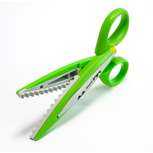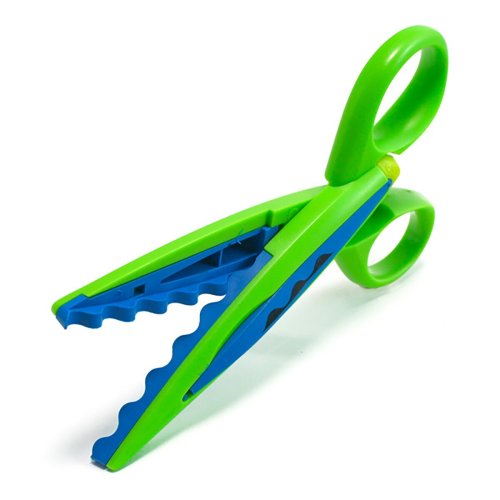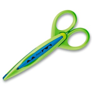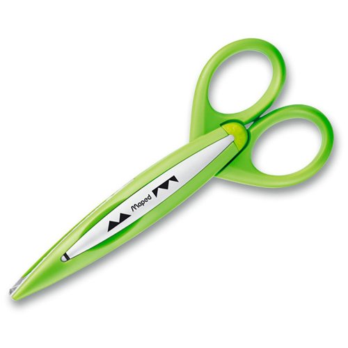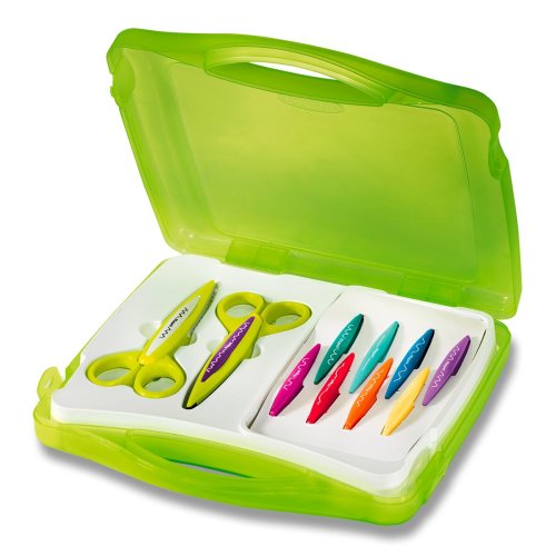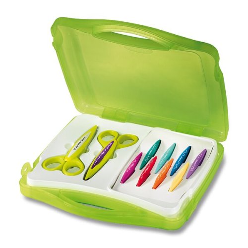 Kreativní nůžky pro děti i dospělé. Snadno vyměnitelné dekorativní čepele ze skelného vlákna. Nemohou stříhat látku, vlasy ani kůži. Stříhají papír 40 až 250 g. Kufřík obsahuje 2 ks nůžek a 10 ks čepelí s různými vzory.