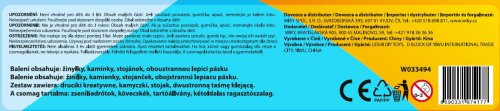 Balení obsahuje: Žinylky, kamínky, 1x obličej, oboustrannou lepicí pásku a stojánek.
