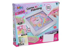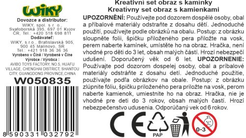 Kreativní set obraz s kamínky dino. Velikost 17,5x17,5x1,5cm. Obsahuje misku na kamínky, pero na nabírání a umísťování kamínků, kamínky různých barev, vosk, rámeček. Postup: z obrázku sloupněte folii, špičku přiloženého pera přiložte na vosk, perem naberte kamínek, umístěte ho na obraz.