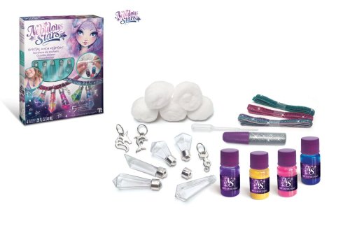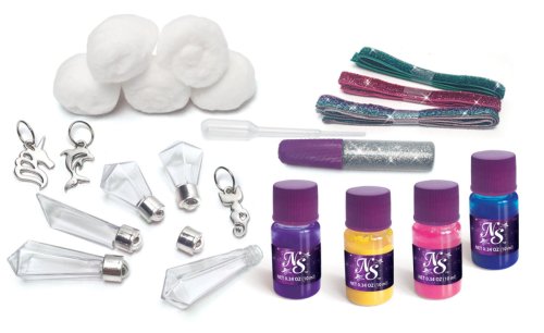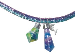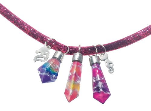 Náhrdelník přání. Vyrob si náhrdelník použitím pomůcek obsažených ve výrobku. 5 ks přívěsků ve tvaru krystalu, 5x bavlněná vatička, 3 třpytivé stuhy, 1x tuba s třpytivým práškem, 4 druhy inkoustů, 3x přívěsek, plastová pipeta.